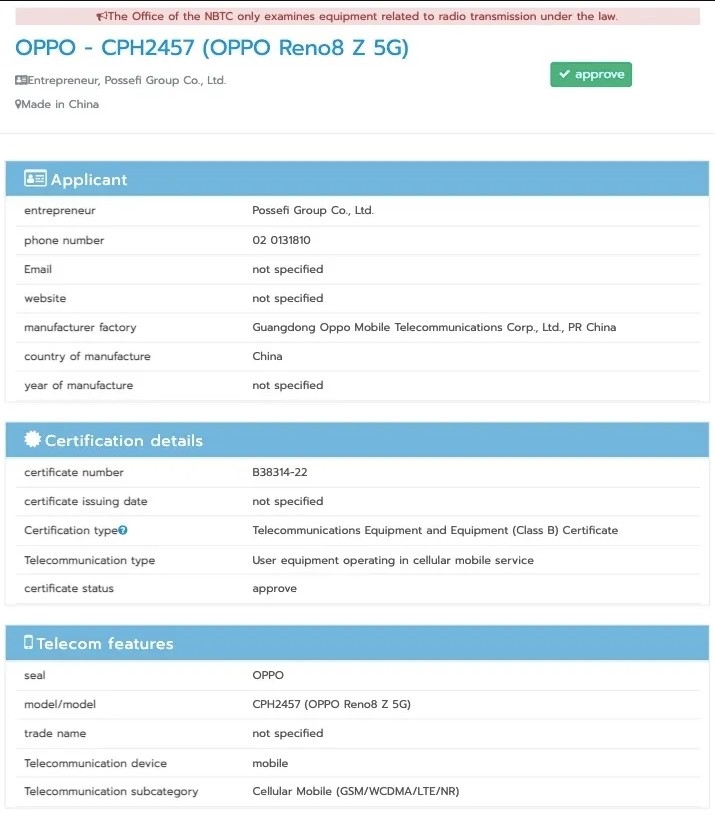 OPPO Reno 8Z est un autre smartphone de la série Reno 8 en préparation. Il devrait être lancé dans les semaines ou les mois à venir. Maintenant, l’appareil est répertorié sur le site Web de certification NCC. Le téléphone portant le numéro de modèle CPH2457 a été également repéré sur les plates-formes de déclaration NBTC et UE.