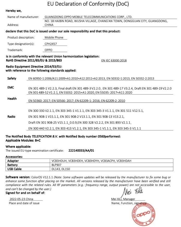 En dehors de cela, la EU Declaration de l’appareil indique que le smartphone contiendrait une batterie portant le numéro de modèle BLP907. La certification NBTC (National Broadcasting and Telecommunications Commission) confirme qu’il aura une capacité de 4 5000 mAh et dispose d’une charge rapide de 33 W prête à l’emploi. Il dispose également d’une prise casque 3,5 mm, d’un port USB Type-C et d’une grille de haut-parleur. Le smartphone 5G fonctionnerait sur ColorOS 12.1.1 basé sur Android 12..