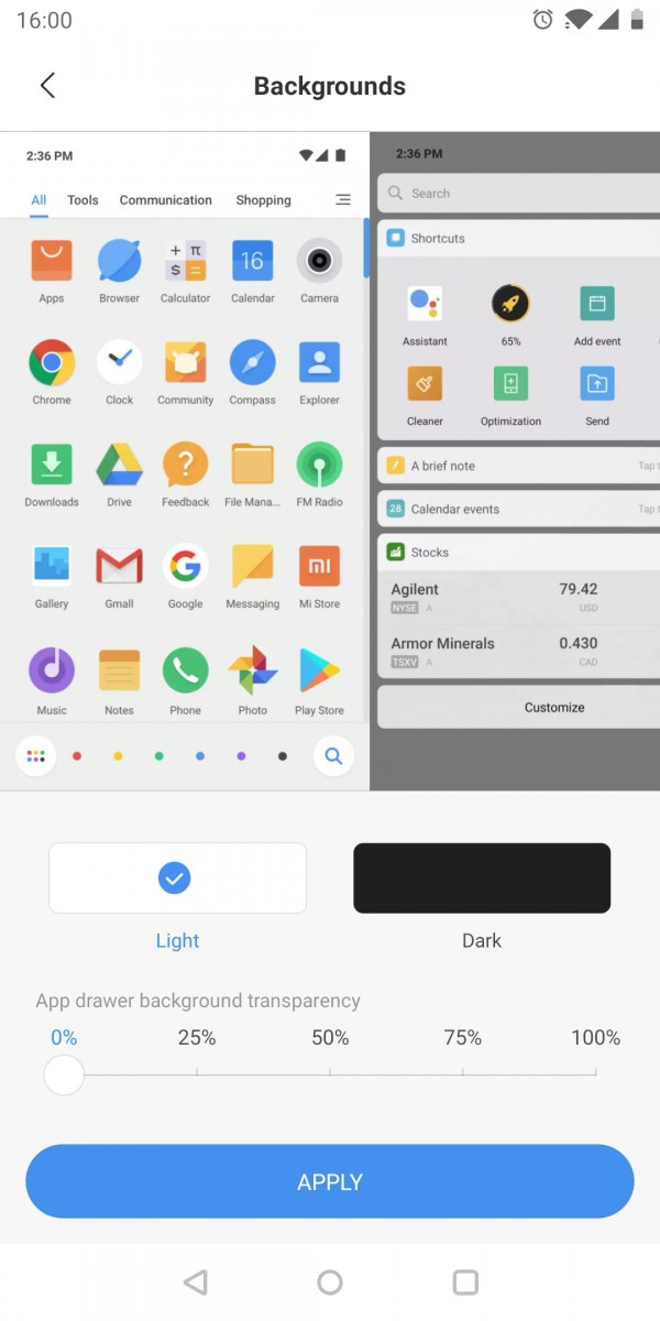 La dernière mise à jour pour le Poco Launcher apporte le mode Dark (il est caché dans le menu Settings, cliquez sur More et ensuite Backgrounds). Vous pouvez également personnaliser la transparence de l’arrière-plan dans le tiroir de l’application, y compris en le réglant sur noir pur.