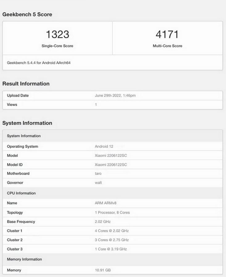 En ce qui concerne les résultats de référence, le futur produit phare de Xiaomi à marquer 1323 points lors de la phase de test monocœur. Alors que, dans le tour multicœur, les scores ont été enregistrés à 4171 points. Benchmark révèle également les principales spécifications de l’appareil, notamment la présence d’un chipset octa-core ayant un cœur principal cadencé à 3,19 GHz, trois fonctionnant à 2,75 GHz et quatre cœurs d’efficacité cadencés à 2,02 GHz. Les tâches graphiques sont assurées par un GPU Adreno 730. En dehors de cela, la liste révèle également que le smartphone dispose de 12 Go de RAM et démarrera sous Android 12 hors de la boîte. Nous pouvons nous attendre à voir le skin MIUI 13.